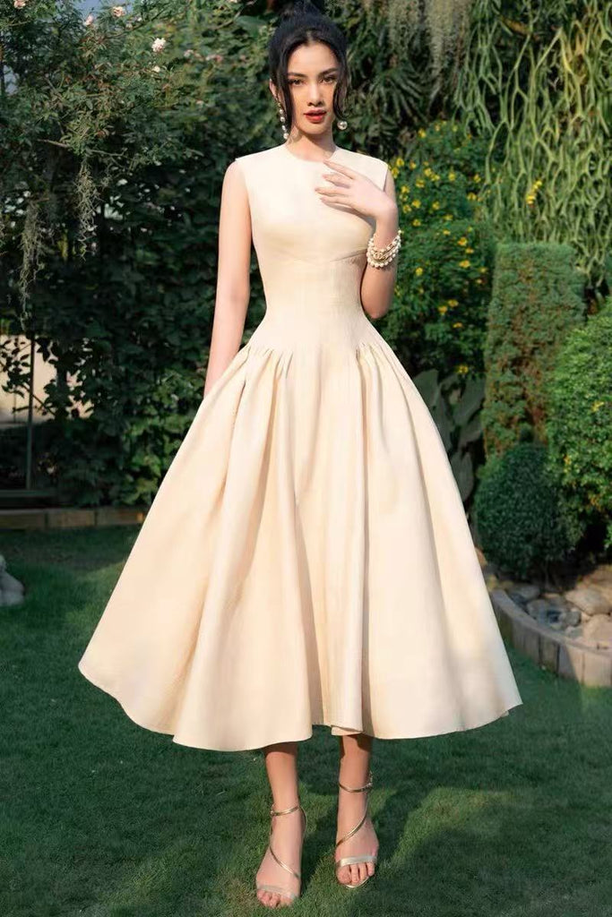 A-line Big Swing Sleeveless Midi Dress In Beige