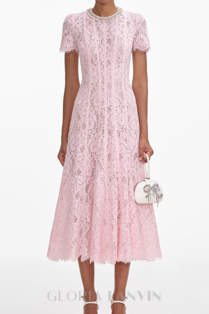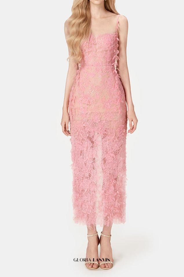 PINK FLORAL LACE EMBROIDER MIDI DRESS