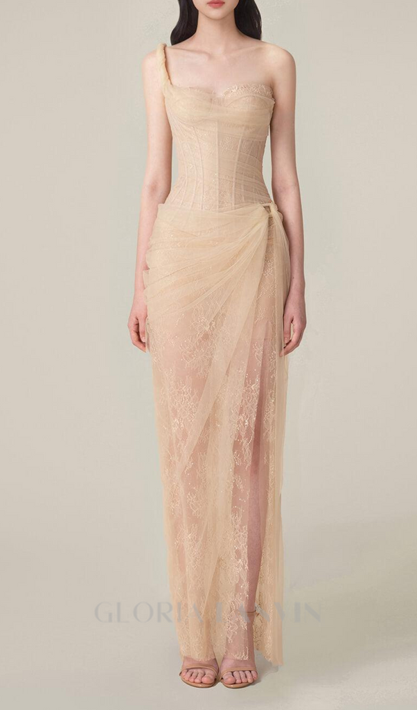 ONE SHOULDER MESH RUCHED MIDI DRESS IN PALE YELLOW