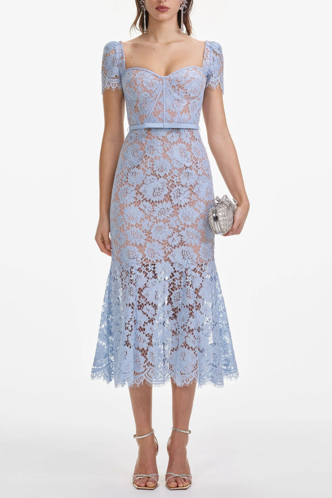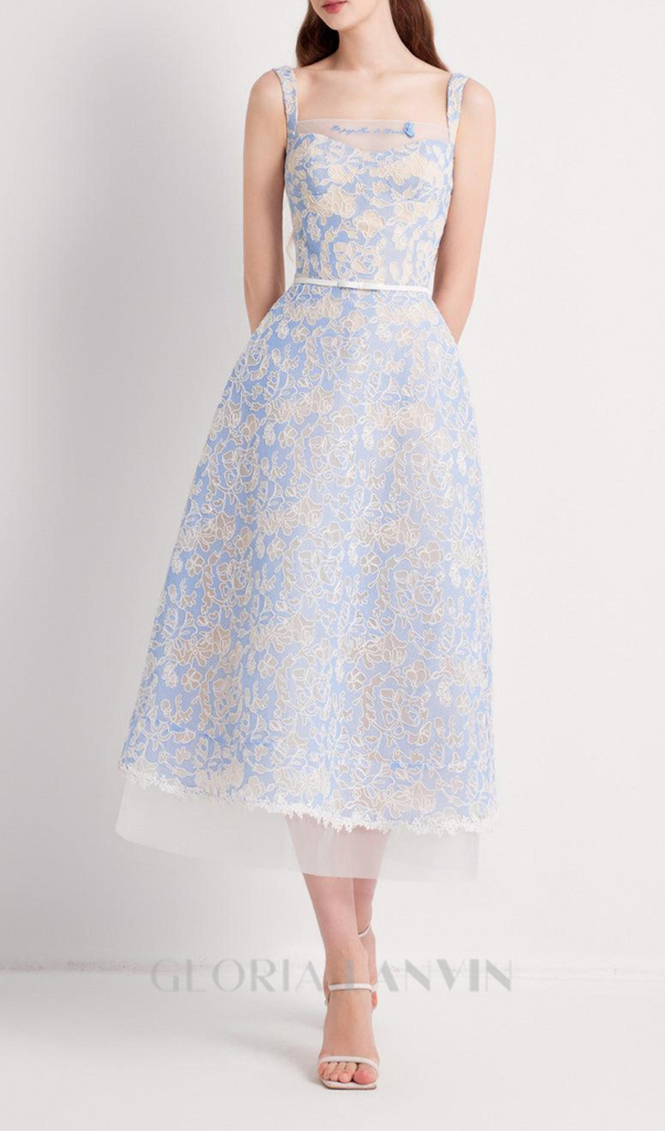 A-LINE SQUARE NECK EMBROIDERED LACE MIDI DRESS IN BLUE