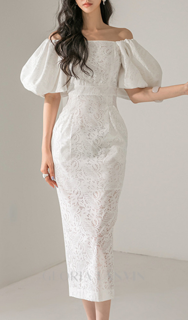 NATALIE PUFF SLEEVE OFF SHOULDER WHITE LACE MIDI DRESS