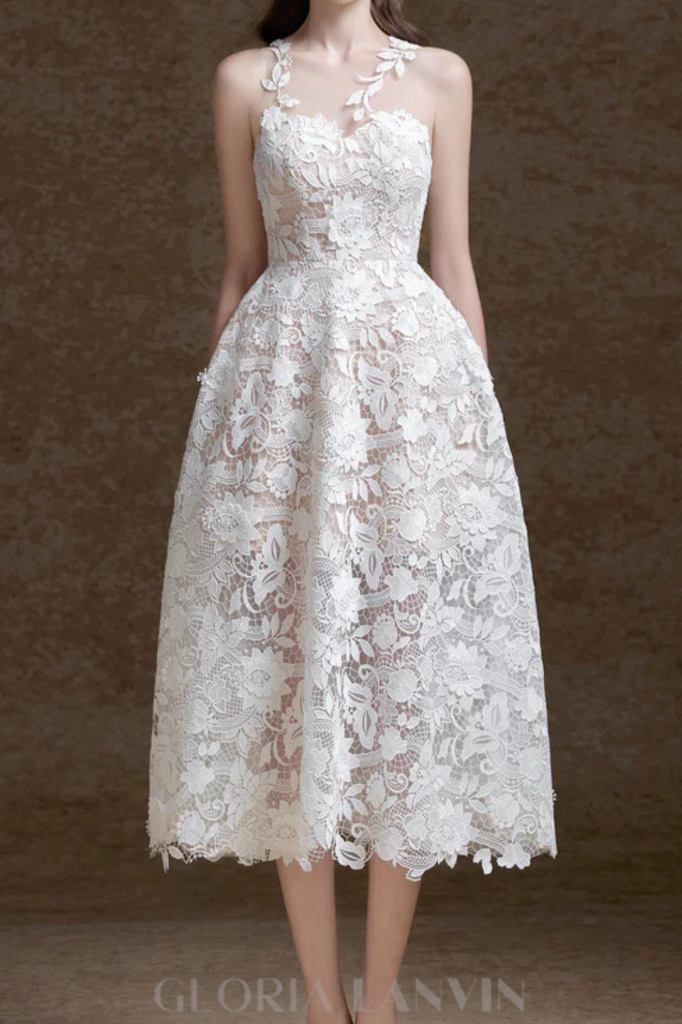 Fae A-line Square Neck Lace Midi Dress in cream white