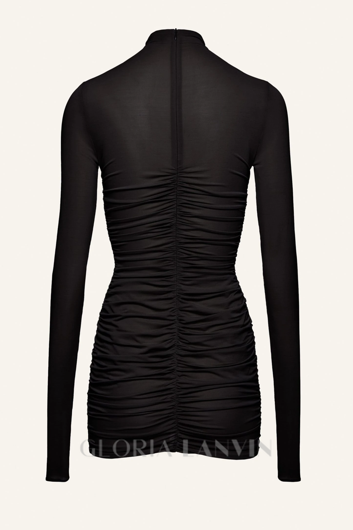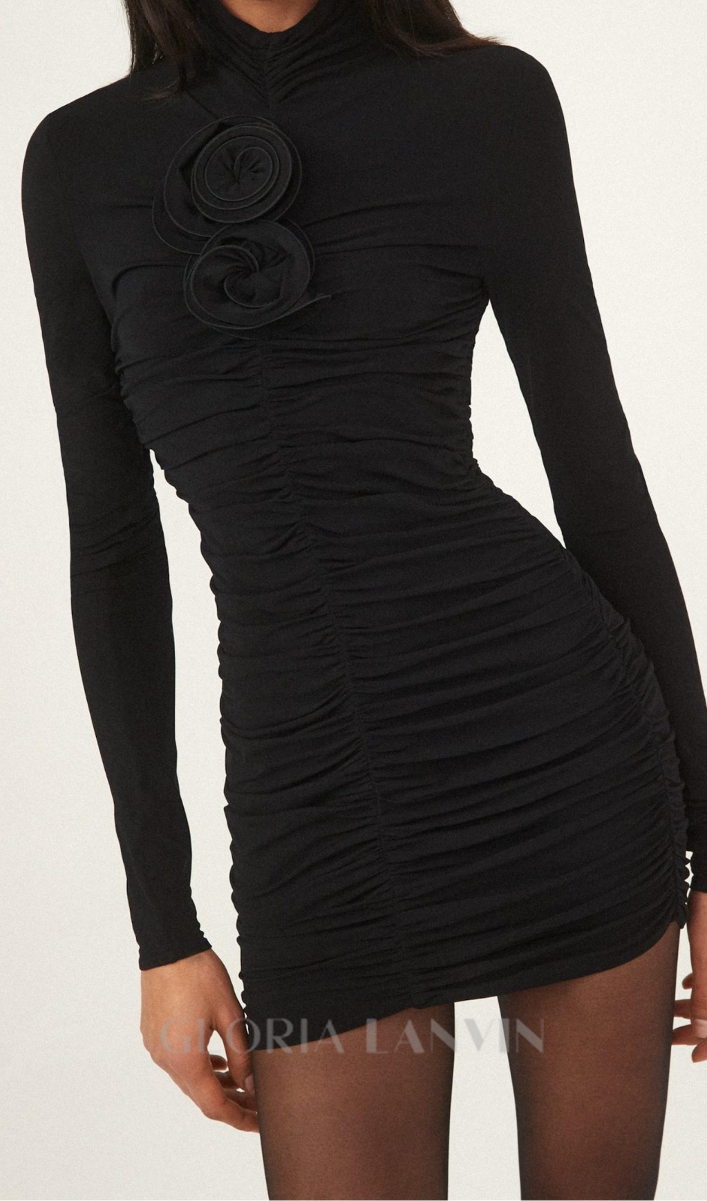 - 3D floral, solid color, black, jersey, mini dress, long sleeve