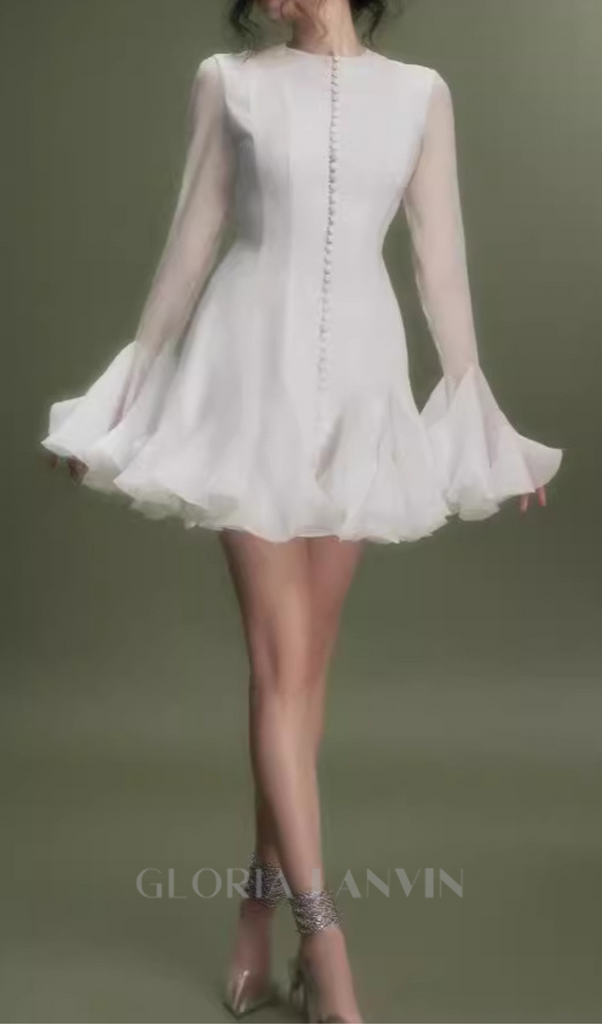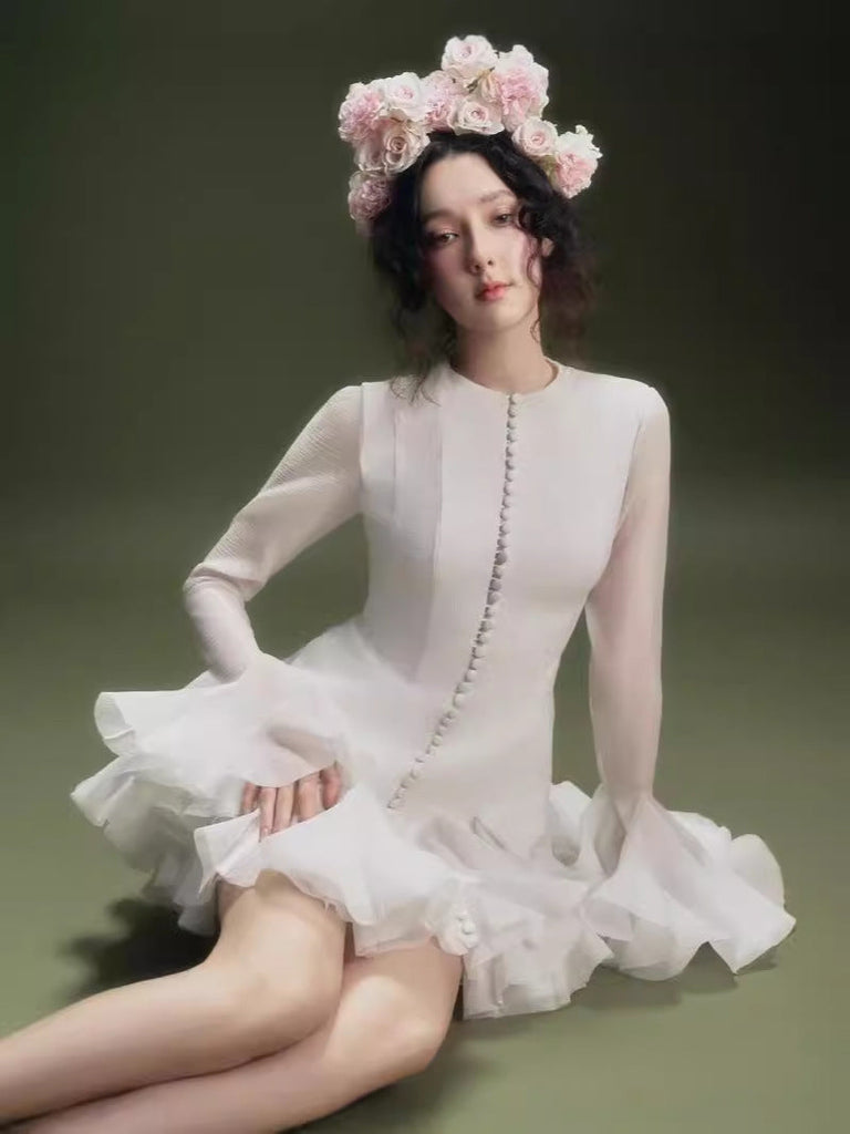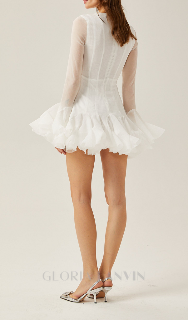 This stunning dress features a semi-sheer fabric, creating an aura of sophistication and allure. The flared silhouette adds a touch of playfulness while still embodying grace and elegance. Elevate your wardrobe with this exclusive piece.