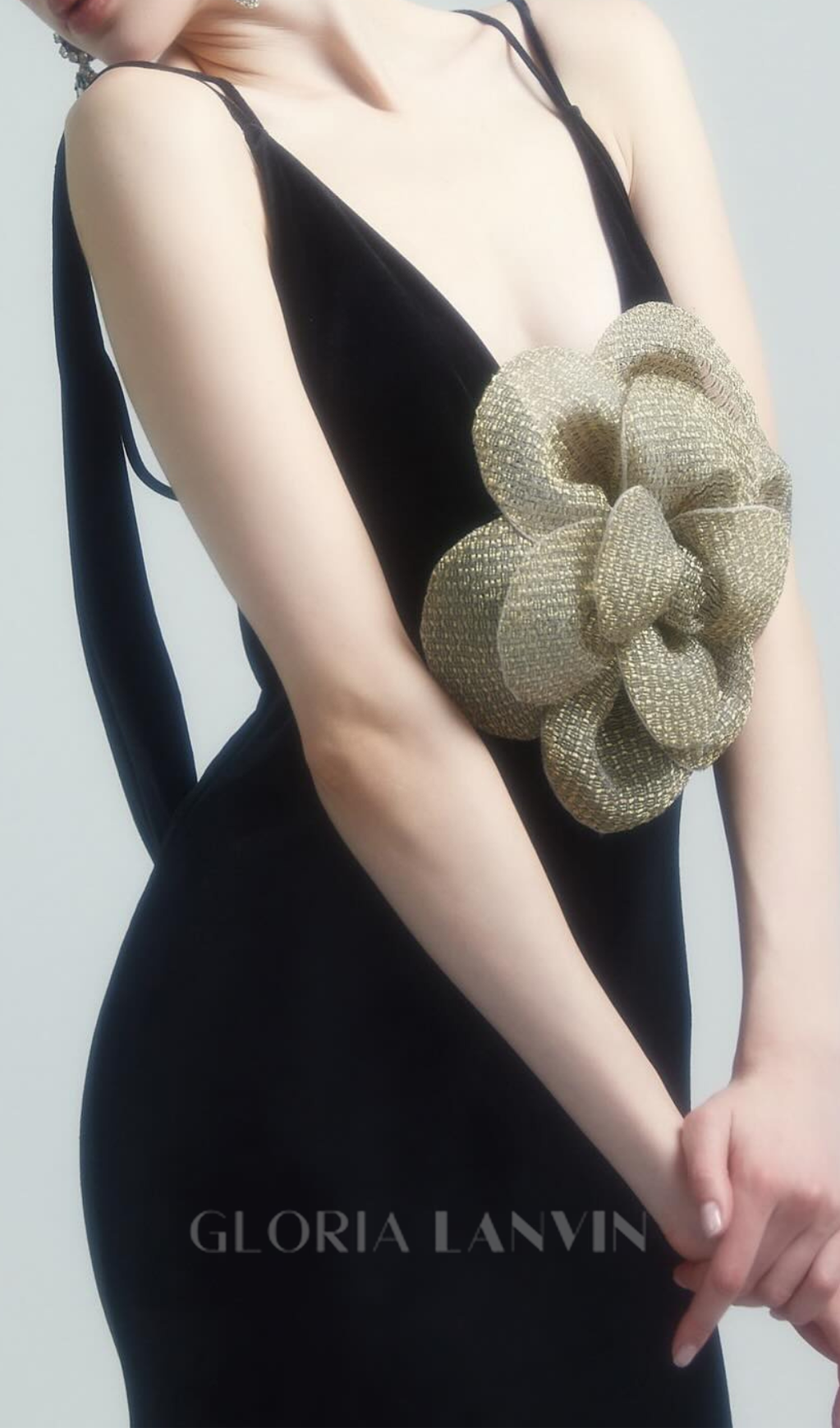 HARRIET GOLD 3D FLOWER BODYCON BLACK MAXI DRESS