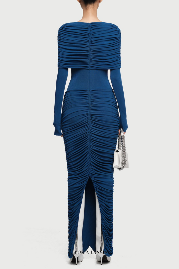 The Alice navy maxi dress combines architectural tailoring with fluid elegance. Precision pleating throughout the bodice creates dimensional texture and subtle movement, while the form-fitting silhouette skims the body with refined sophistication. An asymmetrical draped shoulder adds a distinctive design element that elevates the piece beyond conventional evening wear. The flowing maxi length provides graceful coverage and movement. Crafted for those who appreciate considered design details, this dress transitions seamlessly from formal occasions to upscale social events.