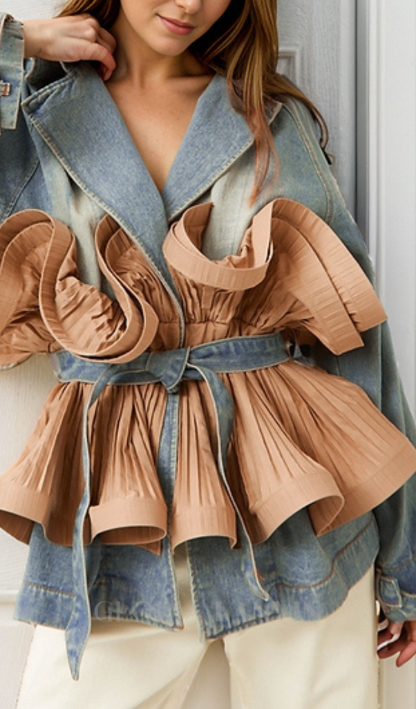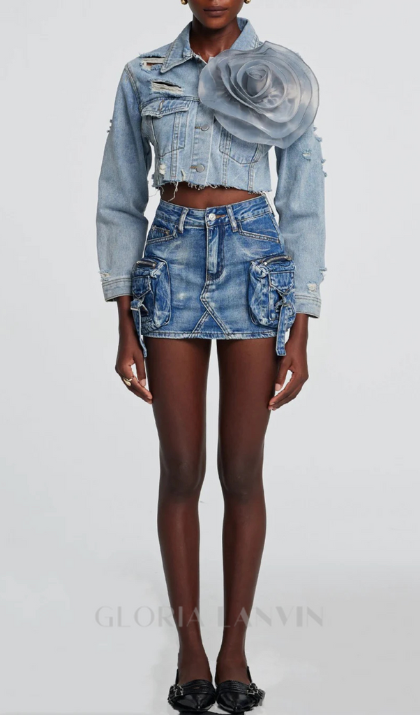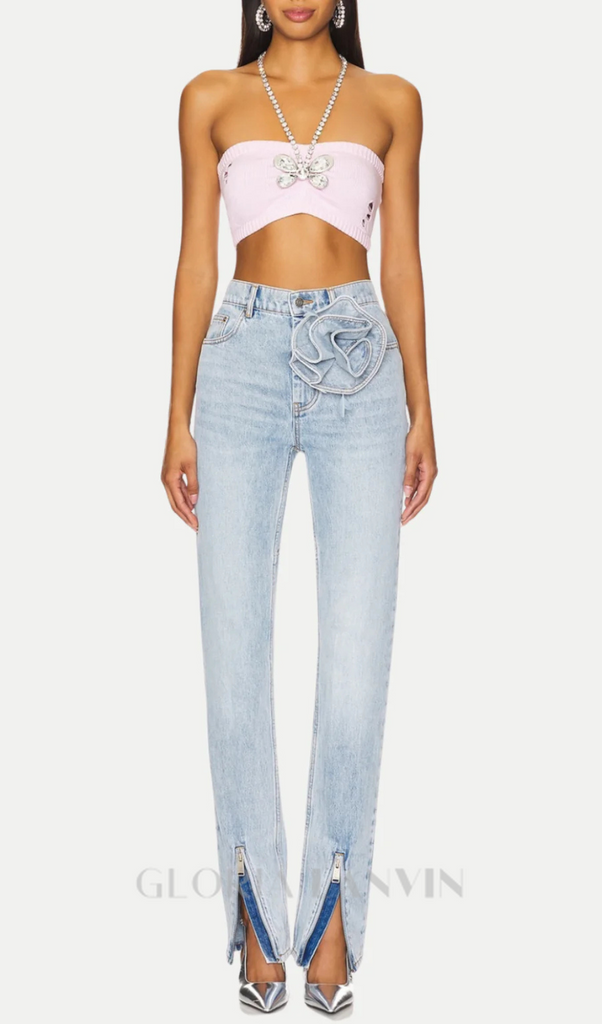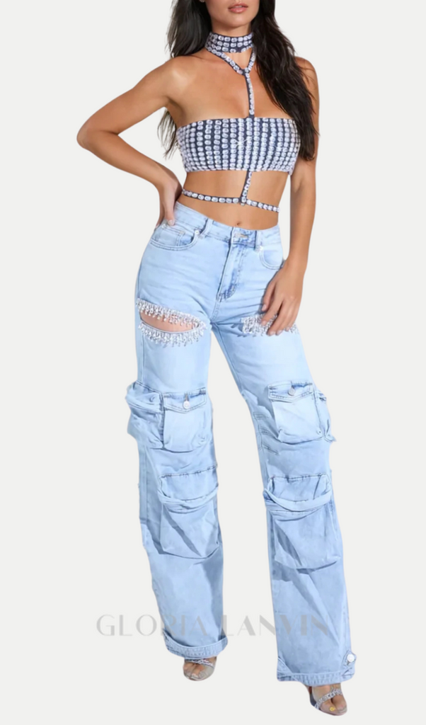 RHINESTONE TASSEL DENIM CROPPED TOP IN BLUE