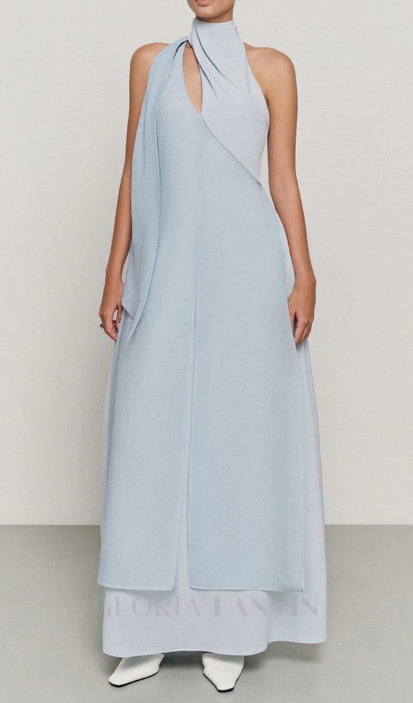 Yen Layered High Neck Floss Silk maxi Dress in blue