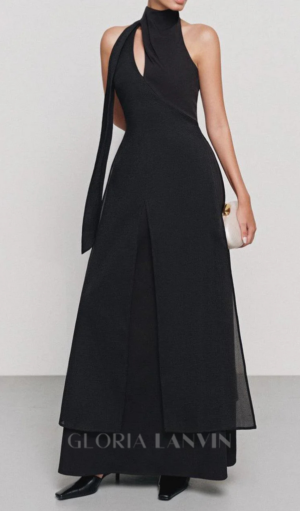 Yen Layered High Neck Floss Silk maxi Dress in black