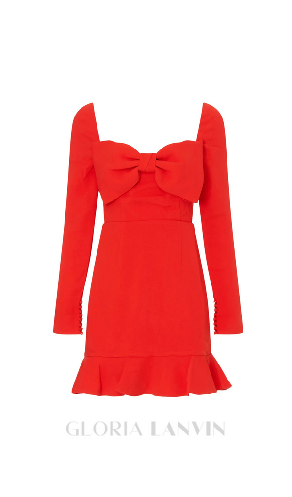 Crafted from a rich red crepe fabric, this mini dress features a playful bow detail and a flattering fit. Perfect for any occasion, this dress adds a touch of sophistication while showing off your fun and flirty side. Embrace your inner fashionista with the Bow Crepe Mini Dress in red.
