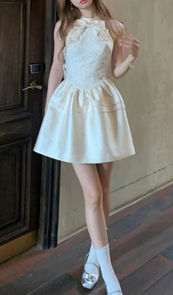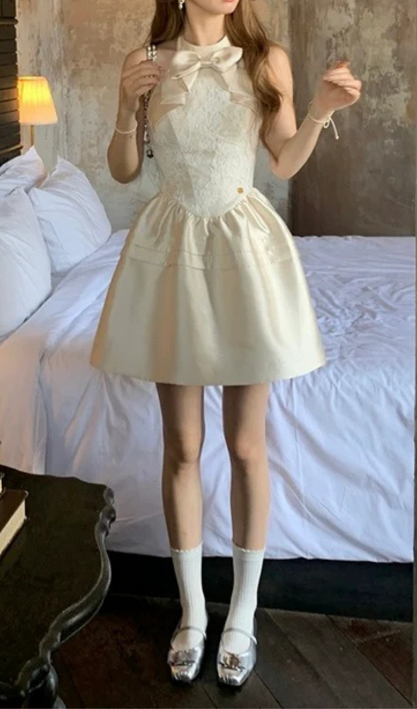 The beautiful lace and patchwork details create a unique and eye-catching piece that will make you stand out. The bow embellishment adds a touch of femininity and charm. Perfect for any special occasion or event, this dress will have you feeling confident and stylish.