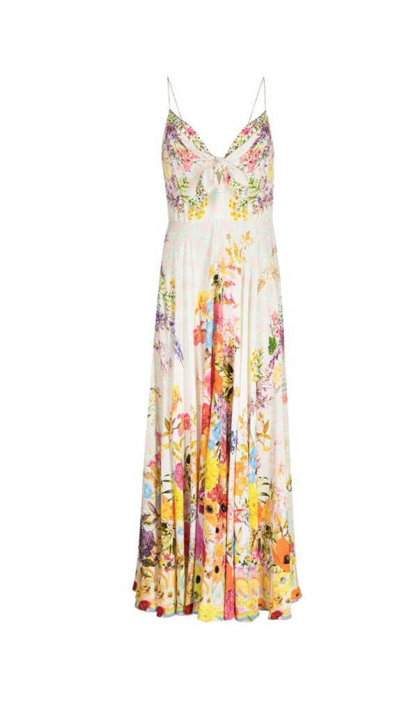 a stunning dress crafted from luxurious silk and adorned with a beautiful floral print and a charming bow detail. Elevate your wardrobe and make a statement with this elegant and feminine piece. Perfect for any special occasion!