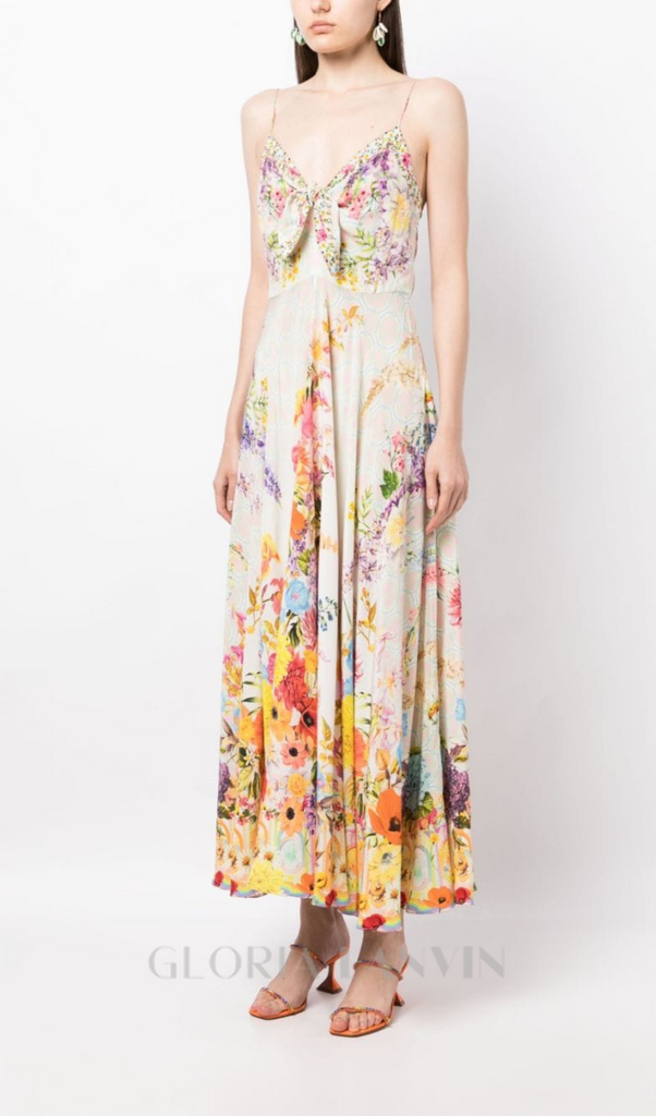 BOW FLORAL-PRINT SILK MIDI DRESS