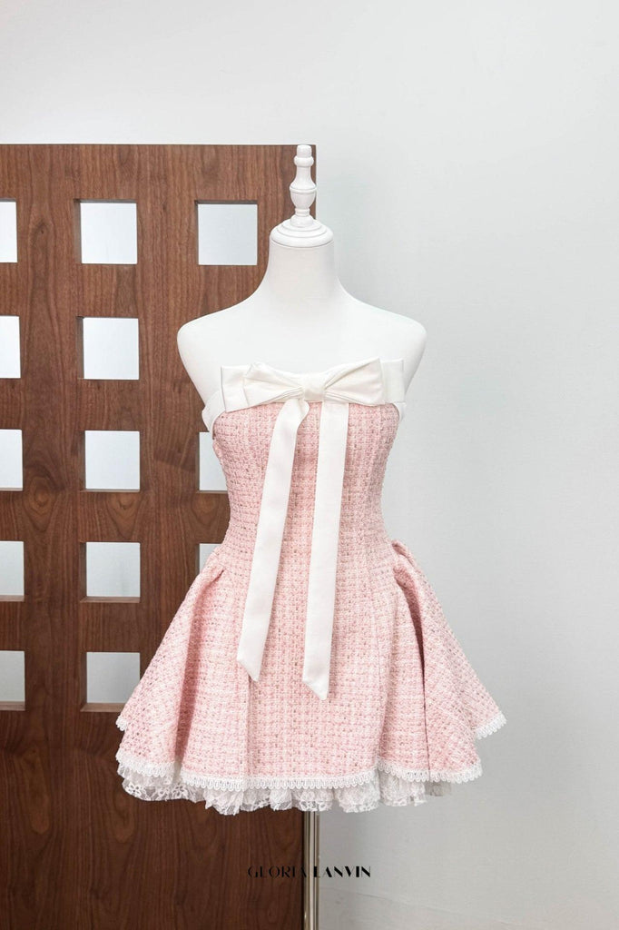 This pink mini dress features a delicate woven lace fabric that offers a refined texture and subtle elegance. Designed as a tube top silhouette, it provides a strapless, body-hugging fit that enhances your natural shape. A charming bow detail adds a sophisticated touch, making this dress ideal for stylish evening events or special occasions where a polished yet playful look is desired.
