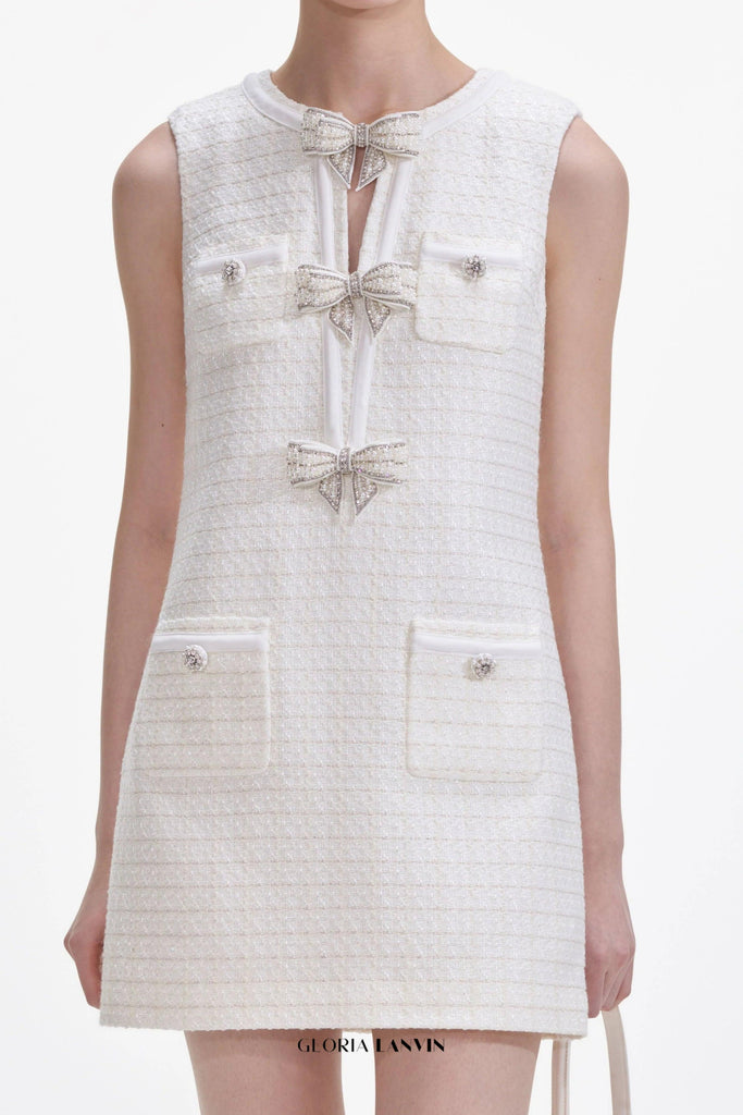 Chic and fitted, this cream bouclé mini exudes refined elegance. Enhanced with sparkling trims and embellished bow detailing, show off its leg-lengthening hem with a pair of sky-high platforms.