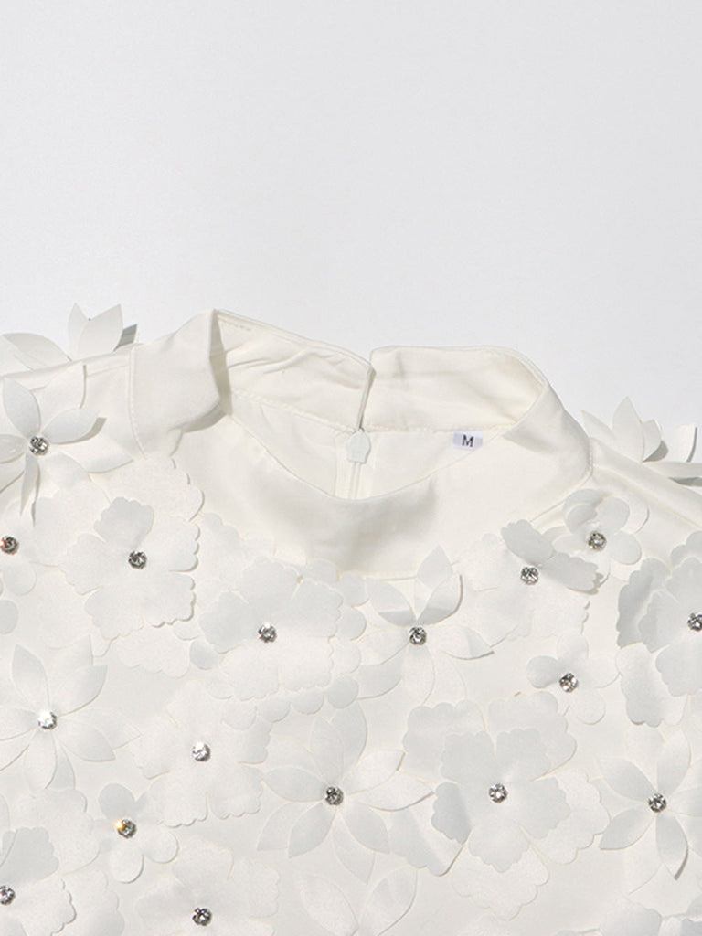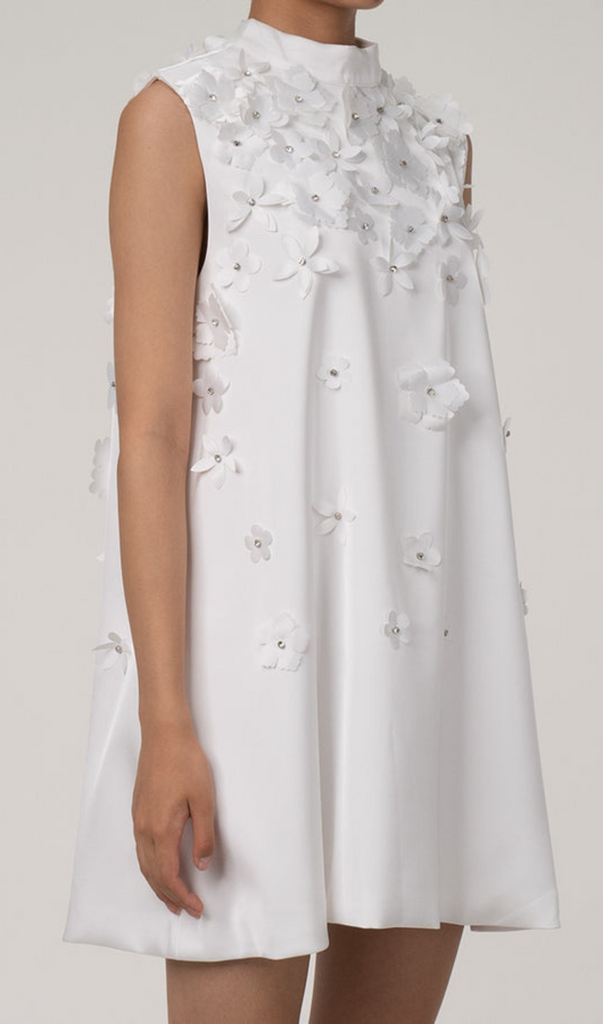 LYDIA FLOWER APPLIQUE MOCK NECK BOW TRIM MINI DRESS