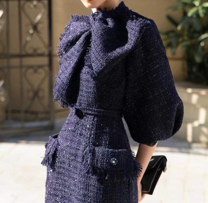 The Mildred Tweed Bow Collar Midi Dress in Dark Blue combines timeless elegance with refined craftsmanship. Crafted from quality tweed fabric, this midi-length dress features a distinctive bow collar that adds a sophisticated touch to any occasion. The deep blue hue offers versatility for both professional and social settings. Perfect for those who appreciate classic tailoring with contemporary flair, this dress transitions seamlessly from day to evening wear.
