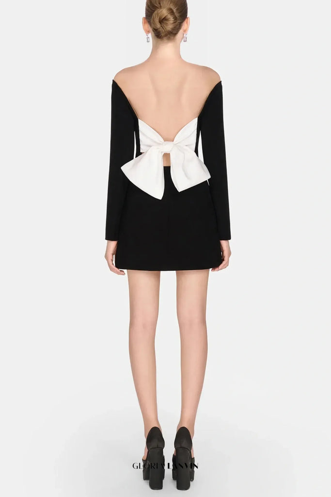 Elevate your style with the Off Shoulder Bow Embeliished Backless Mini Dress. With its elegant off-shoulder design, sophisticated bow detail, and stunning embellishments, this dress will turn heads and make you feel like a true fashion icon. Show off your shoulders and make a statement at any event.