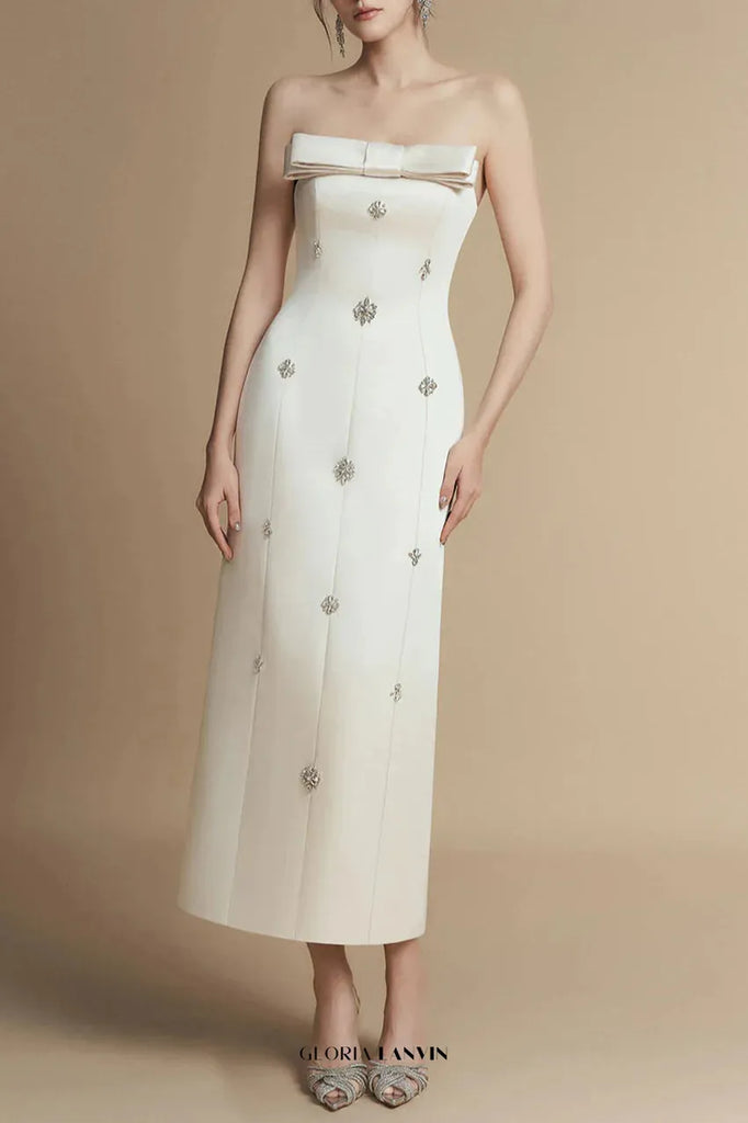 This sheath midi dress features a straight-across neckline crafted from lustrous taffeta fabric, offering a structured yet elegant silhouette. Its tailored fit enhances the natural shape, making it ideal for formal occasions or sophisticated events. The midi length balances modern style with classic refinement, ensuring a polished and timeless look.