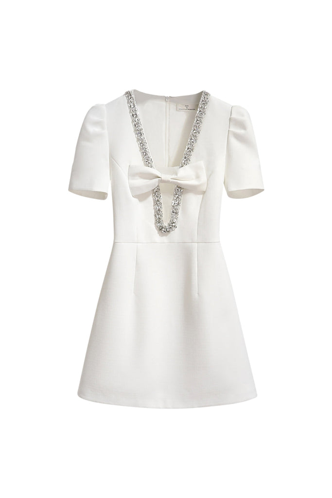 This ivory mini dress features a sophisticated V-neckline and delicate diamond chain detailing, accentuated by an elegant bow. Its refined design combines modern charm with timeless elegance, making it an ideal choice for upscale events or stylish evening outings. The flattering silhouette ensures a confident fit, while the subtle shimmer of the diamond chain adds a touch of luxury. Perfect for those seeking a statement piece that balances grace and contemporary fashion.