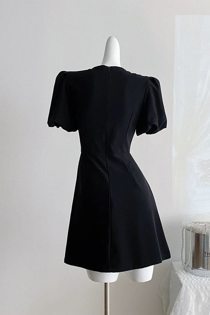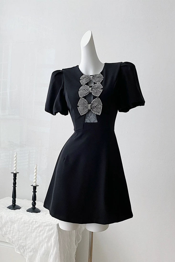 Be cute'n'comfy in this flirty little black mini dress with short sleeves, round neckline, and bow detailing. Its hollowed out design will make sure you look sweet and sassy every time!