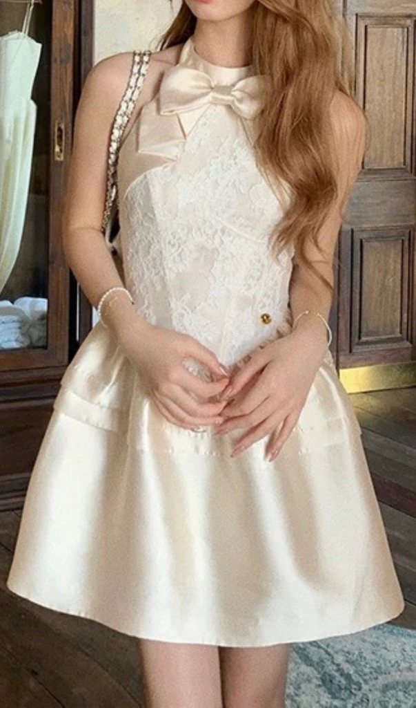 ALYSSA BOW SATIN MINI DRESS IN WHITE