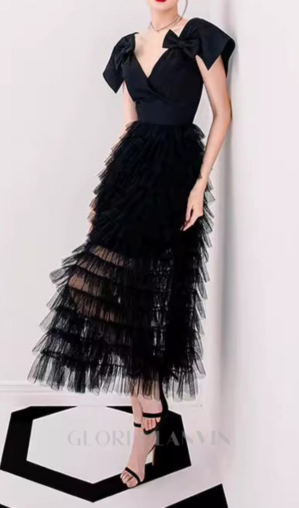 V NECK MESH RUFFLES PATCHWORK BOWKNOT MIDI DRESS