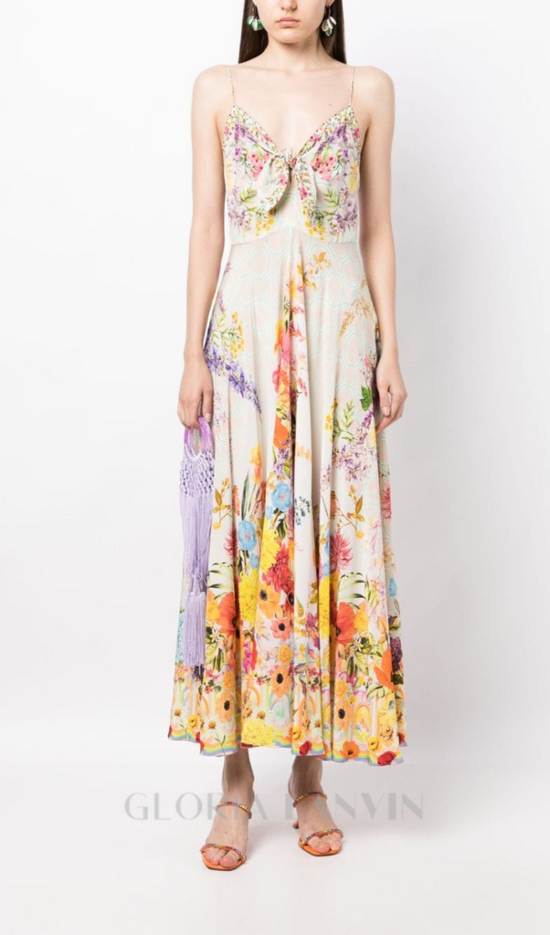BOW FLORAL-PRINT SILK MIDI DRESS