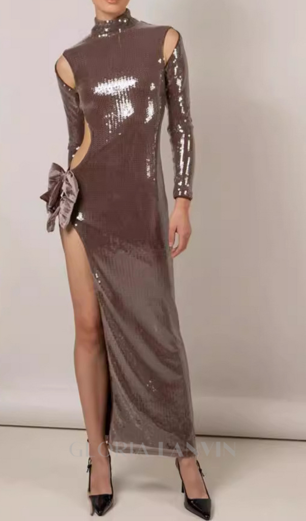 SETLLA BOW DETAIL SEQUIN MAXI DRESS IN BROWN