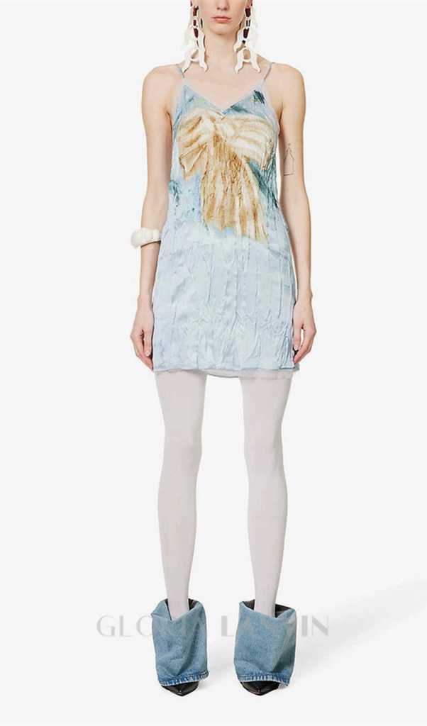 BOW-PRINT TULLE-TRIMS SATIN MINI DRESS IN PALE BLUE