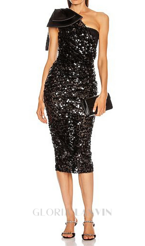MARY BLACK SEQUINED LONGUETTE DRESS WITH BOW