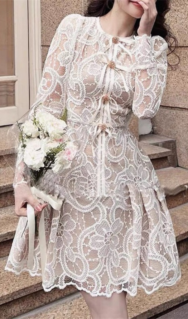 DIAMOND BUTTON BOW LACE HOLLOW OUT MINI DRESS