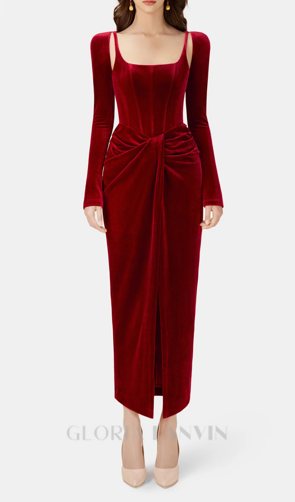 BURGUNDY STRAPLESS VELVET MIDI DRESS
