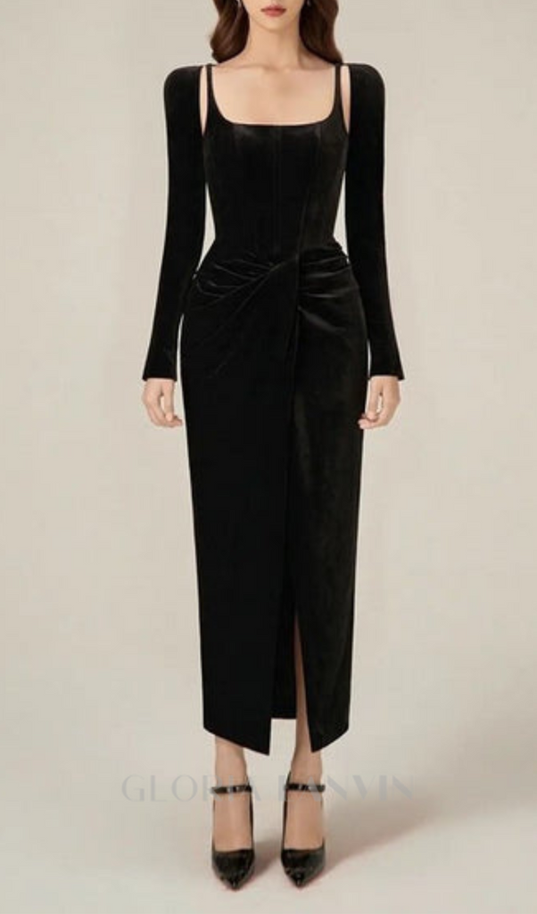 MESH ASYMMETRICAL VELVET BODYCON MIDI DRESS