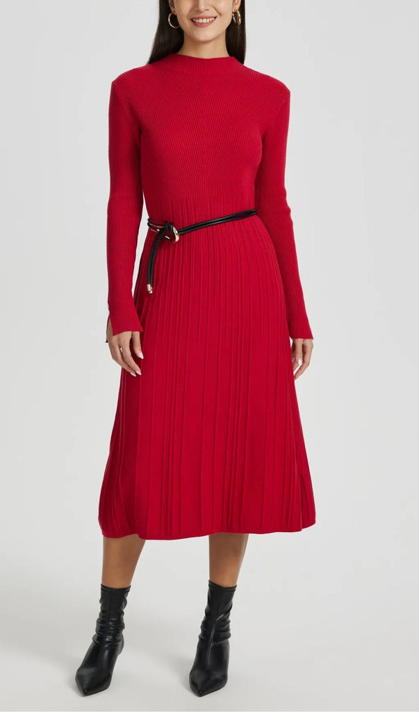 LONG SLEEVE KNIT MIDI DRESS IN RED