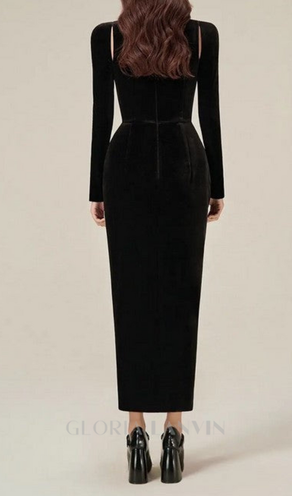 Expertly crafted with black velvet, this midi dress exudes elegance and sophistication. The draped design flatters all body types, while the luxurious fabric adds a touch of opulence. Perfect for special occasions or a night out, this dress is a timeless addition to any wardrobe.