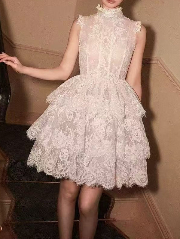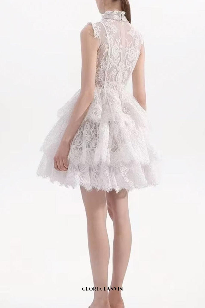 This elegant sleeveless mini dress features a sophisticated stand collar and delicate lace detailing, complemented by a playful tutu-style skirt. The pristine white color offers versatile styling options for various occasions. The structured collar adds a refined touch to the feminine silhouette, creating a perfect balance between formal elegance and youthful charm.