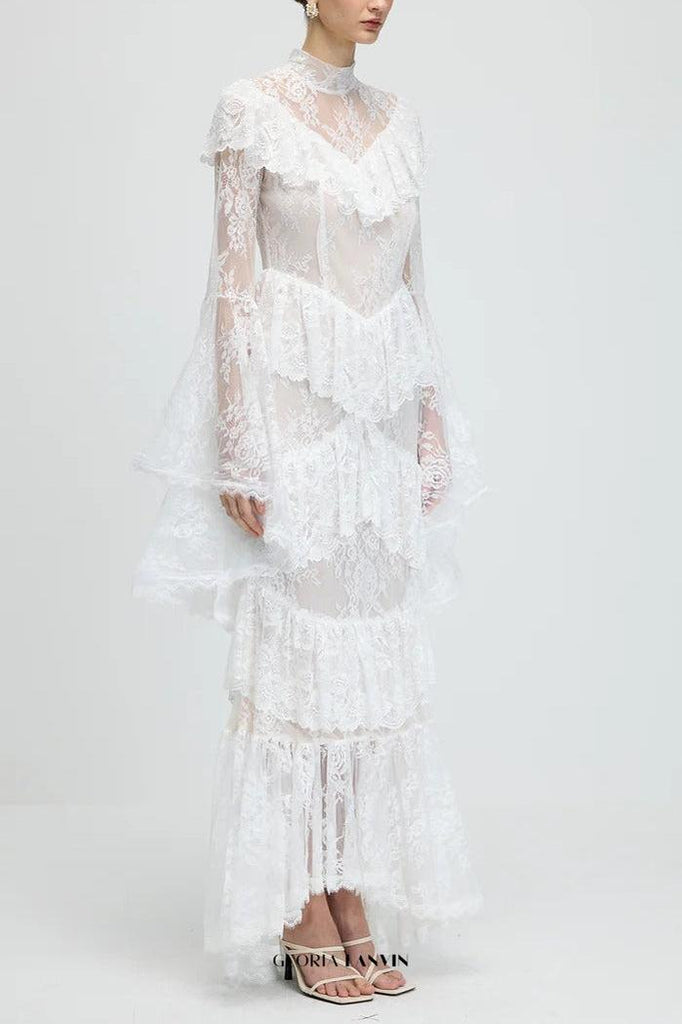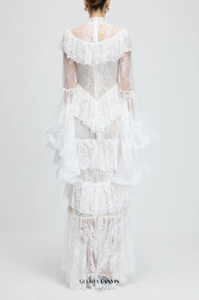 sylvia Sheer lace trumpet sleeve maxi dress in white – Gloria Lanvin