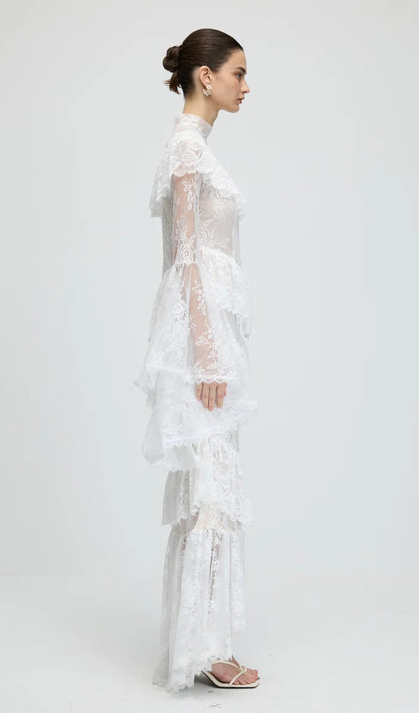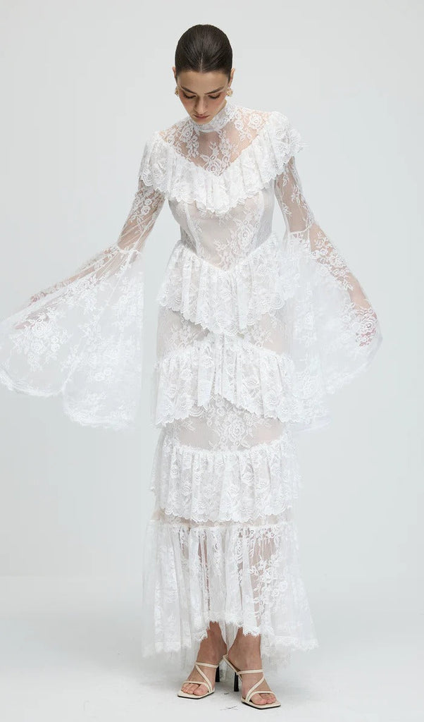 sylvia Sheer lace trumpet sleeve maxi dress in white