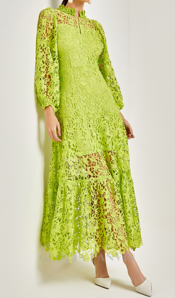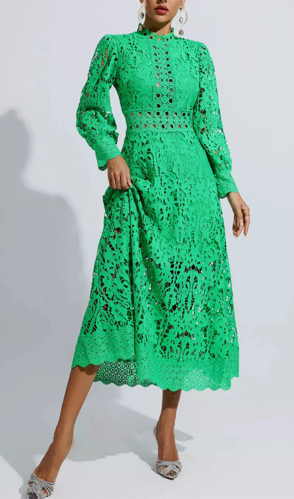 KENZIE GREEN HOLLOW LACE CUTOUT MIDI DRESS