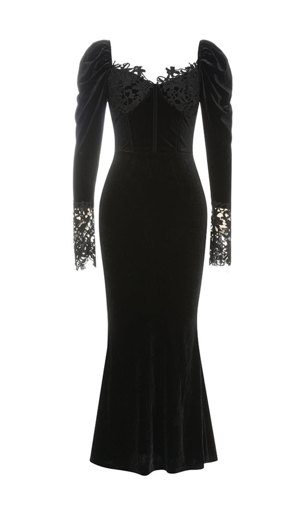 BLACK LONG SLEEVE LACE VELVET MAXI DRESS
