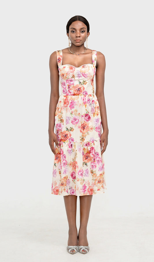 FLOWERS PRINT PUFF SLEEVE MIDI DRESS IN PINK
