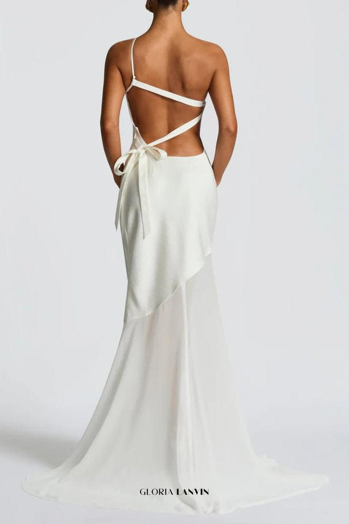 This ivory satin maxi dress features a sophisticated lace-up beveled back design, combining elegance with a flattering fit. The smooth satin fabric drapes beautifully, offering a luxurious feel and graceful movement. Perfect for formal occasions, this dress balances classic style with modern detailing for a refined, expert look.