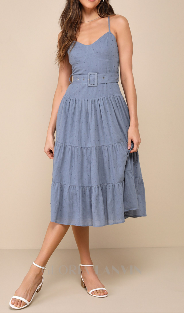 slate blue swiss dot bustier tiered midi dress