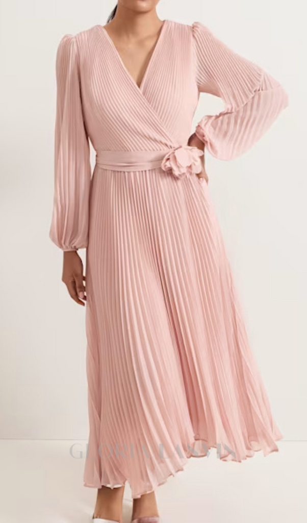 lantern sleeve pleated maxi dress in pale pink