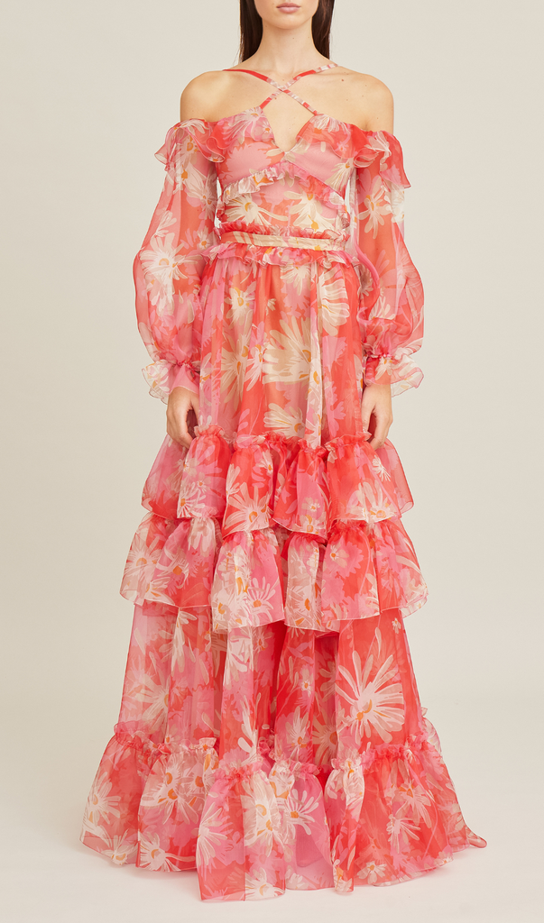 PRINTED OFF-THE-SHOULDER SILK ORGANZA MAXI DRESS