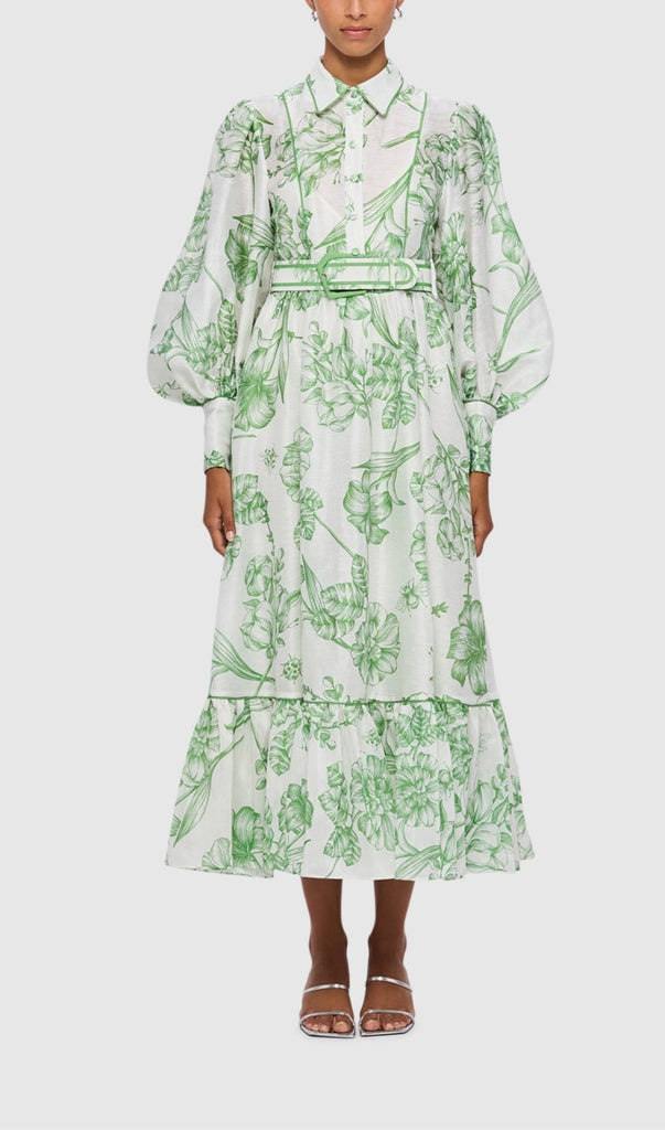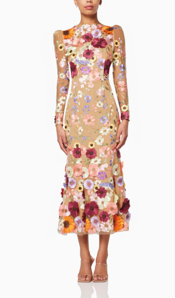 KATE LONG SLEEVE 3D FLORAL PRINT MIDI DRESS