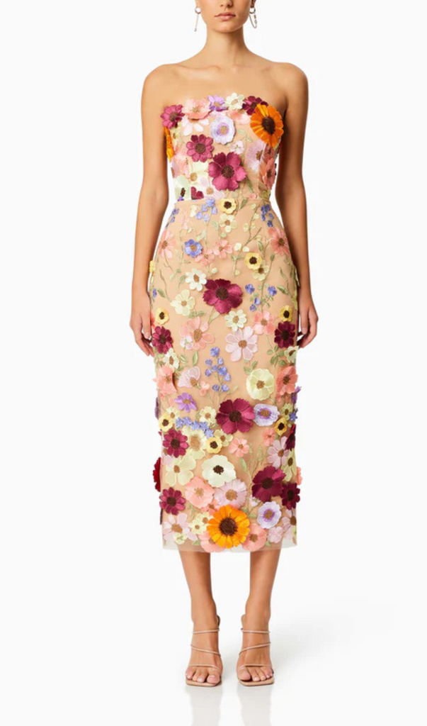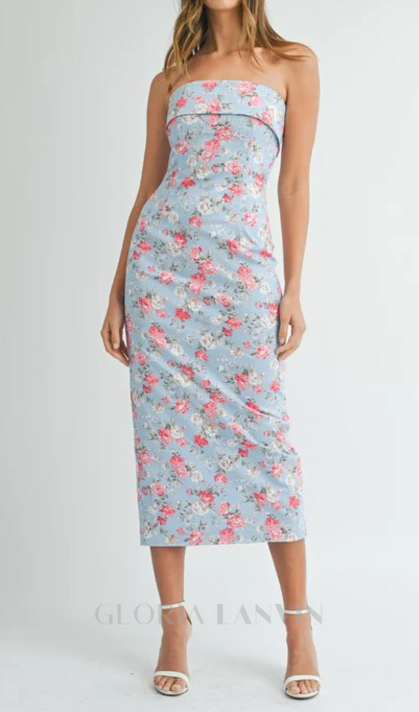FLORAL PRINT STRAPLESS MIDI DRESS