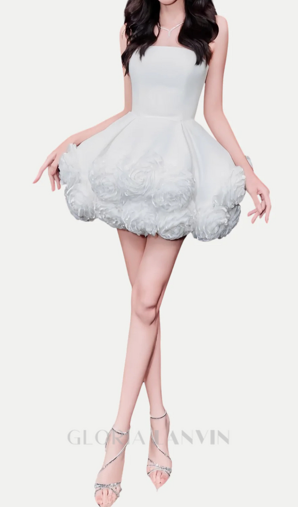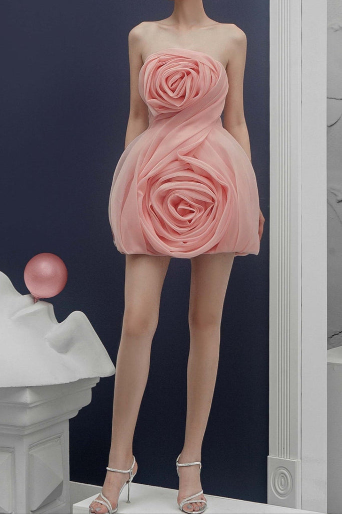 STRAPLESS 3D FLOWER MINI DRESS IN PINK