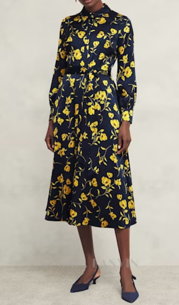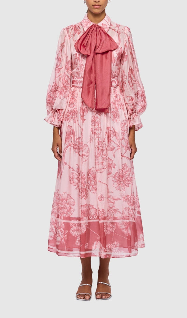HARMONY PRINT IN PLUM BLOSSOM TIE NECK MIDI DRESS